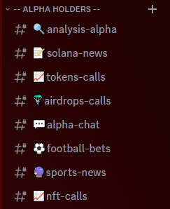 By being part of this family, you can automatically opt for great opportunities such as Whitelist and pre-sales of the best future solana projects, which already guarantees you can obtain those projects early, you can also obtain sports betting calls, airdrops calls, weekly market alpha analysis, exclusive giveaways for holders, etc.